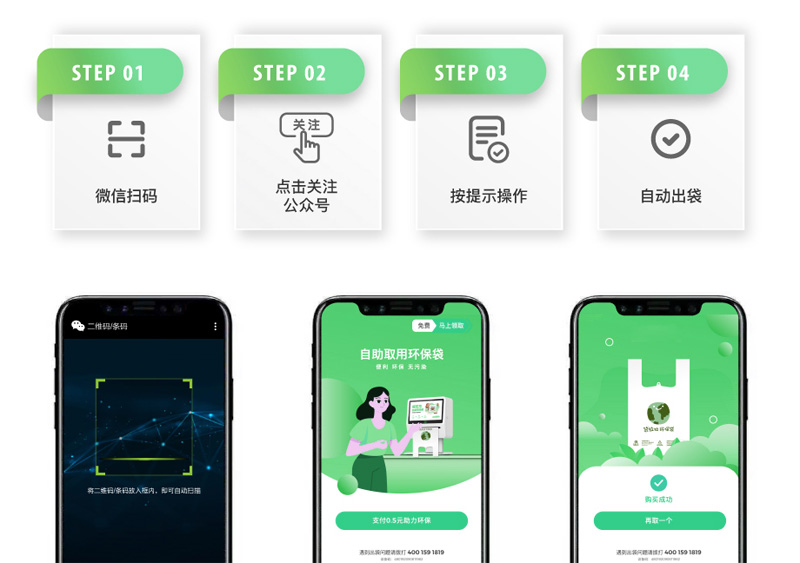 只需簡單四步,便可獲去一個(gè)環(huán)保袋。智能監(jiān)控,無人化管理,經(jīng)營管理接近零成本。